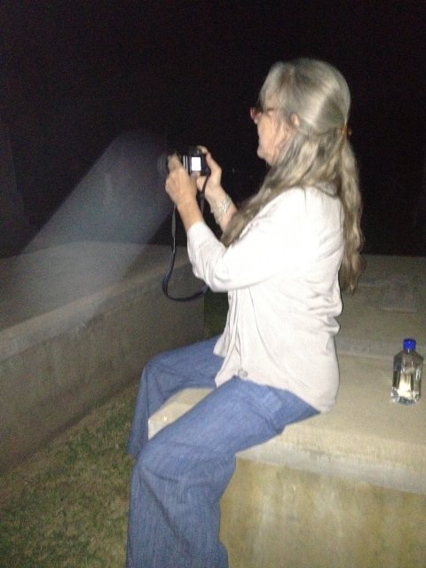 David took this picture of Anne sitting on her favorite 'friend'.Anne could not see the beam of light you see.